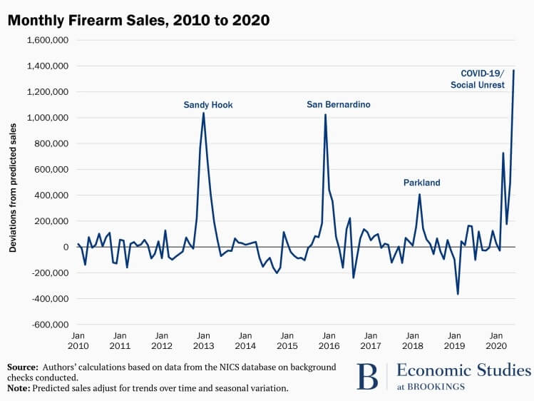 每當美國社會出現濫射槍擊案,總會激起槍枝管制的辯論;諷刺的是,槍枝銷量也跟著上升。根據美國著名智庫布魯金斯研究院(The Brookings Institution)數據,2012年桑迪胡克小學槍案及2018年道格拉斯中學槍案後,槍械銷量都衝上高峰。且不單是槍擊案所造成的恐懼,COVID-19疫情與先前警察壓制造成黑人男子佛洛伊德窒息的事件,也都推升槍枝銷售量。