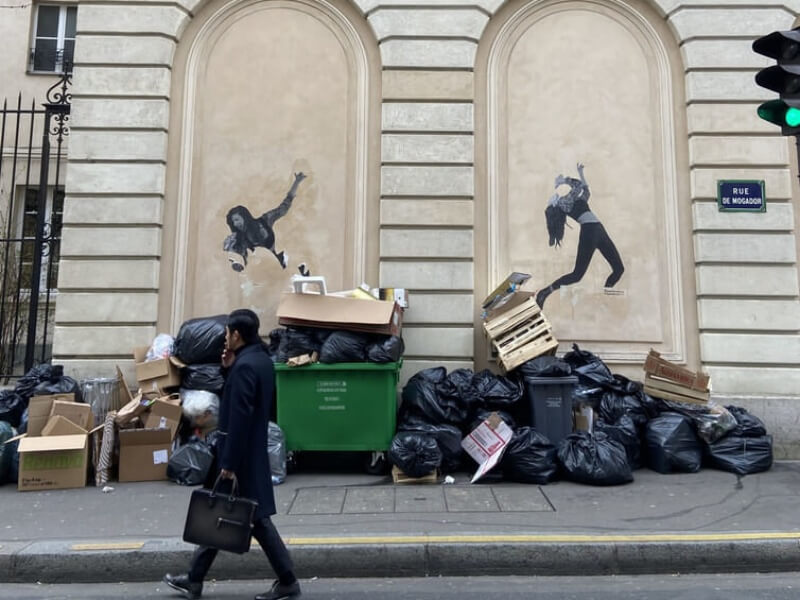 極具爭議性的法案遭到全國工會反對,法國國家鐵路公司(SNCF)等公共服務單位也發動罷工,而其中最引起熱議、「成效」也最驚人的,就屬巴黎市清潔隊員罷工,導致市區路邊9天內堆放超過7000公噸垃圾,即使在攝氏10度下也發出臭味,凱旋門、艾菲爾鐵塔等景點周邊垃圾淹沒人行道,令觀光客大感吃驚,許多人拍下畫面,作為「巴黎回憶」。罷工累積能量施壓政府,但在有效罷工與最低限度服務之間該如何拿捏,是政府與抗爭者社會對話及角力的一大課題。