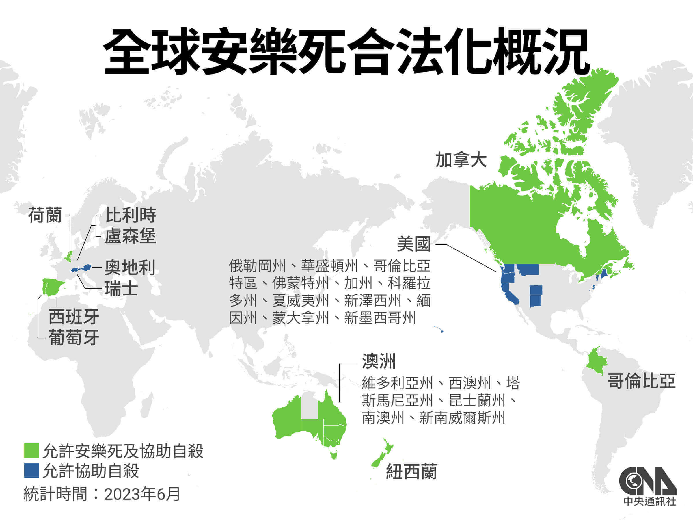 允許安樂死及協助自殺:荷蘭、比利時、盧森堡、西班牙、哥倫比亞、加拿大、葡萄牙、澳洲(維多利亞州、西澳州、塔斯馬尼亞州、昆士蘭州、南澳州、新南威爾斯州)、紐西蘭